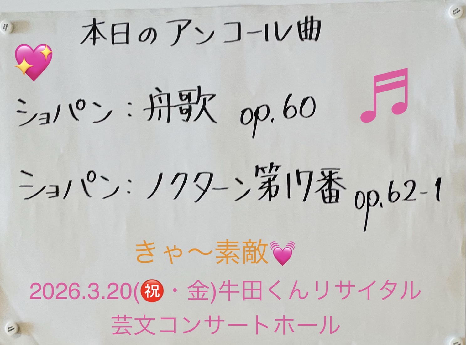 アンコールはショパンの舟唄と私の好きなノクターンOp.62-1でした。この曲は反田君もショパコンで演奏していましたね。これまた素敵すぎて痺れました。本当に贅沢な時間を過ごせたことに感謝です。